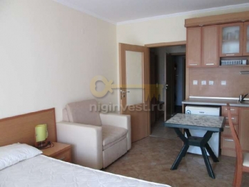 Студията са с площ 34 кв.м, разположени на партерния етаж. Те се продават напълно обзаведени и с цялата необходима техника - фотьойл, маса за хранене с три стола, кухненско обзавеждане, вградени фурна, котлони и аспиратор, телевизор, спалня.Банята е напълно оборудвана със санитарна техника. Има тераса с изглед към басейна.