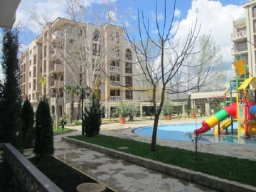 Площадь у квартиры 48 кв.м, на цокальном этаже. Состоится из комфортной и светлой гостиной с большим французким окном, полнастью обустроенного кухонного бокса, одной спальни, ванной с туалетом и душевой кабиной с ванной, террасы с видом на бассейн. Все комнаты на полу плиткой, а стены покрашенные латексом. Ванная – плиткой и фаянсом в свежих цветах.